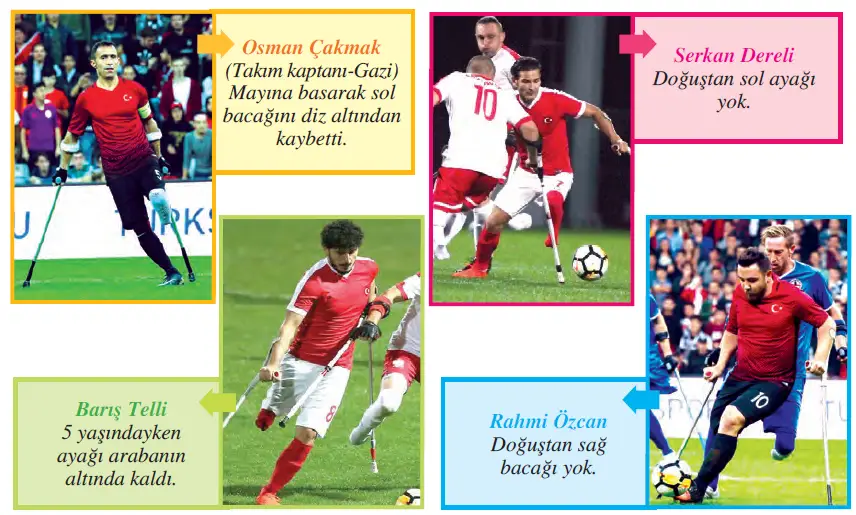 dışlayan insanların kafalarındaki engelli algısının değişmesinde önemli rol oynuyorlar. Bu konudaki en güzel örneklerden biri 2017 yılında ülkemizde yapılan Avrupa Ampute Futbol Şampiyonası’nda yaşandı. Bu şampiyonada Ampute Futbol Millî Takımımız 41 bin kişinin izlediği final maçında İngiltere’yi 2-1 yenerek Avrupa şampiyonu oldu. Şimdi bu takımın bazı oyuncularını yakından tanıyalım.