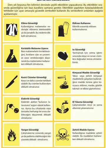 Ders yılı boyunca fen bilimleri dersinde çeşitli etkinlikler yapacaksınız. Bu etkinlikler sırasında güvenliğiniz için bazı kurallara uymanız gerekir. Etkinlikler yapılırken karşılaşılabilecek tehlikeler için uyarı amacıyla güvenlik sembolleri kullanılır. Bu sembollerin anlamları aşağıda