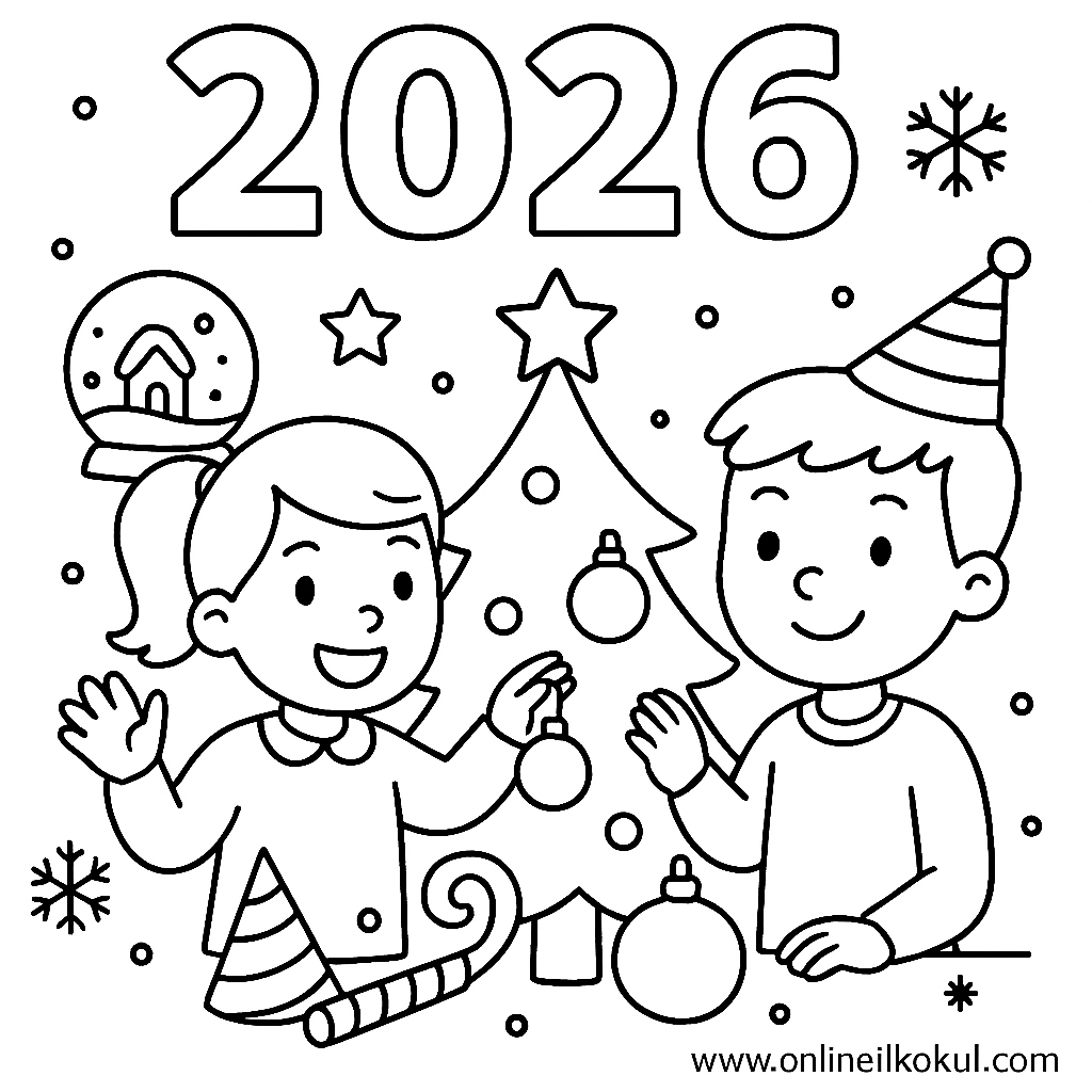 Yeni yıl 2026 kar küresi yıl başı ağacı kız erkek çocuk boyama çalışması
